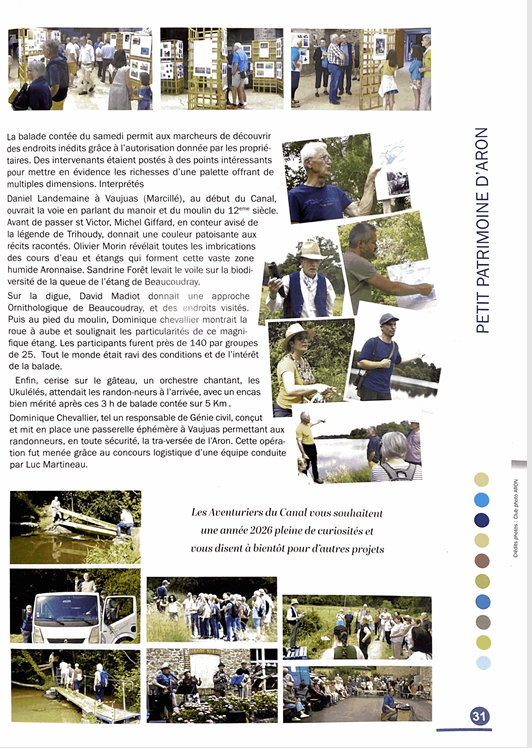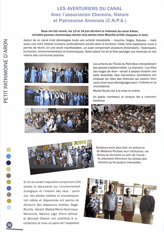 L’événement d’Aventuriers du canal relatant des éléments d’histoire qui ont forgé l’identité d’Aron, en juin dernier a donné lieu à un article dans le bulletin annuel de la mairie en janvier dernier.